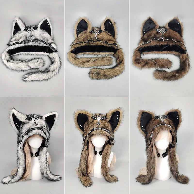 כובע פרווה גותי בסגנון Y2K עם אוזני חתול ואלמנט צלב מתכתי