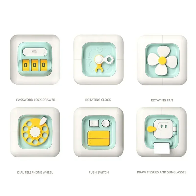 - הקוביה בנויה מחומרים שונים ובעלת טקסטורות מגוונות, מה שמאפשר לתינוק לחוות מגוון של תחושות בעת השימוש, ובכך לחזק את חוש המישוש שלו.